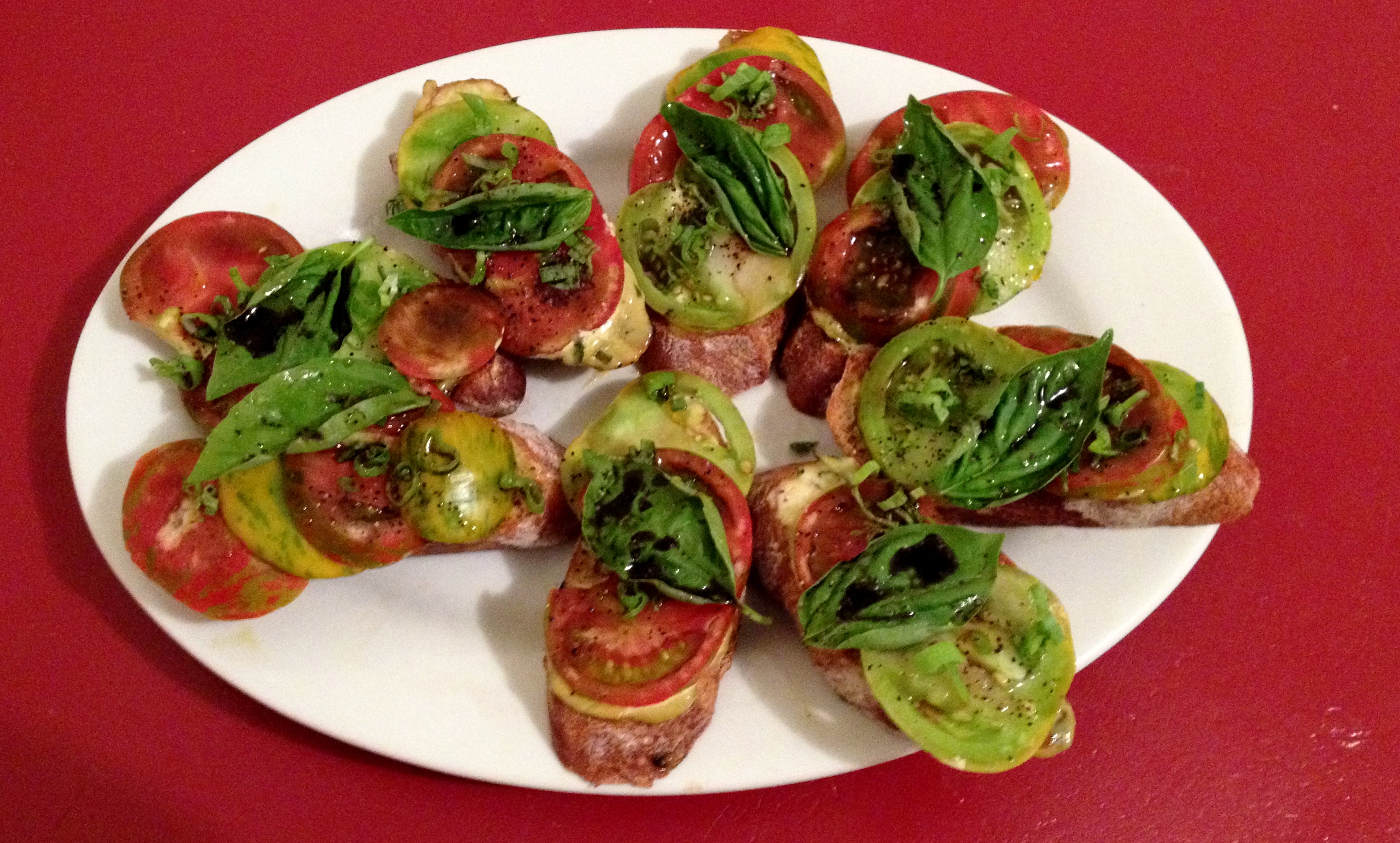 Bruschetta made with Heirloom tomatoes from Edible Earthscapes, Moncure, NC,  baguette from La Farm Bakery, Cary, NC, basil from Wild Onion Farms, Johnston County NC.