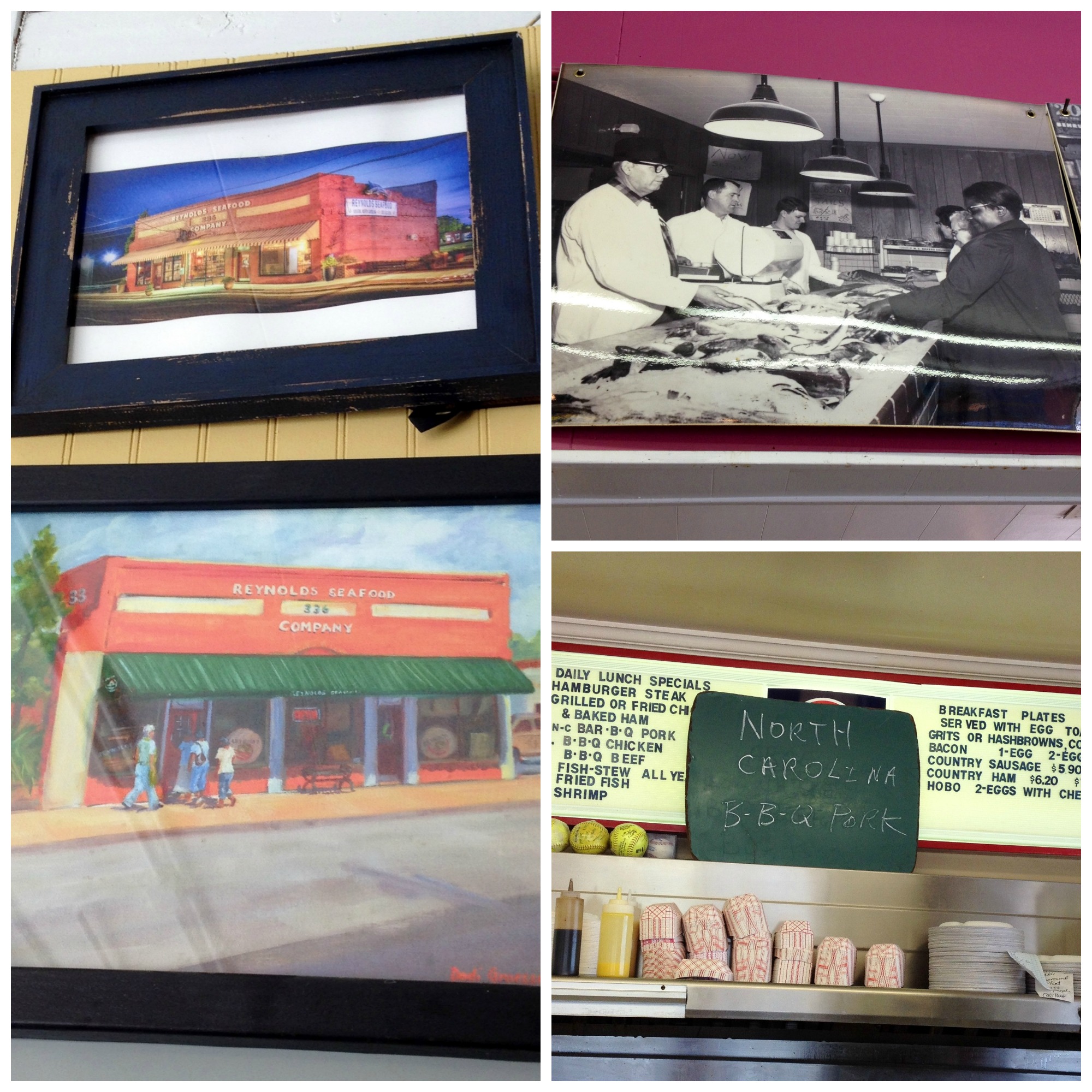 Photos above: paintings and photograph of Reynolds Seafood displayed on store front walls, photograph of menu board at Ken’s BBQ
