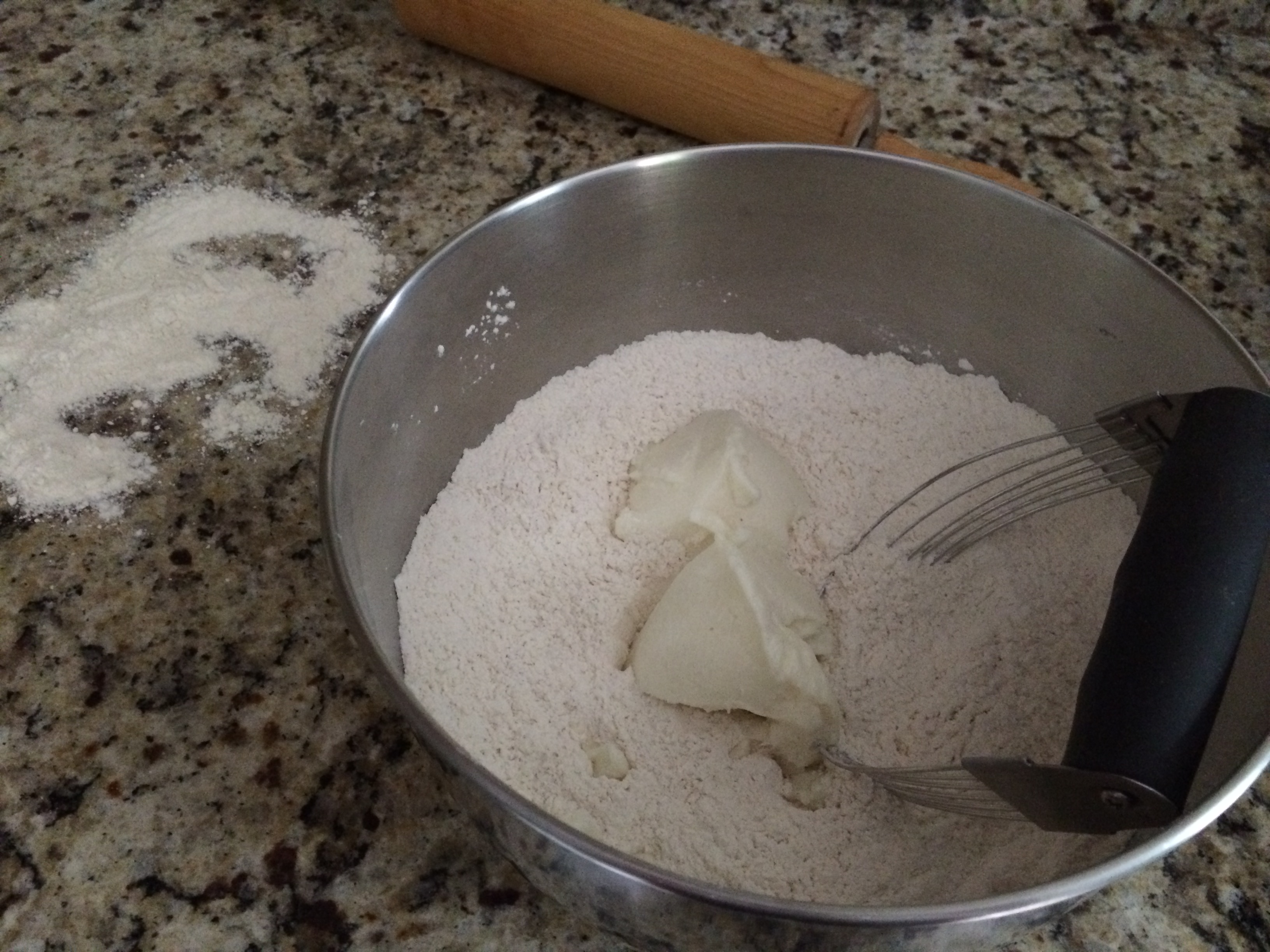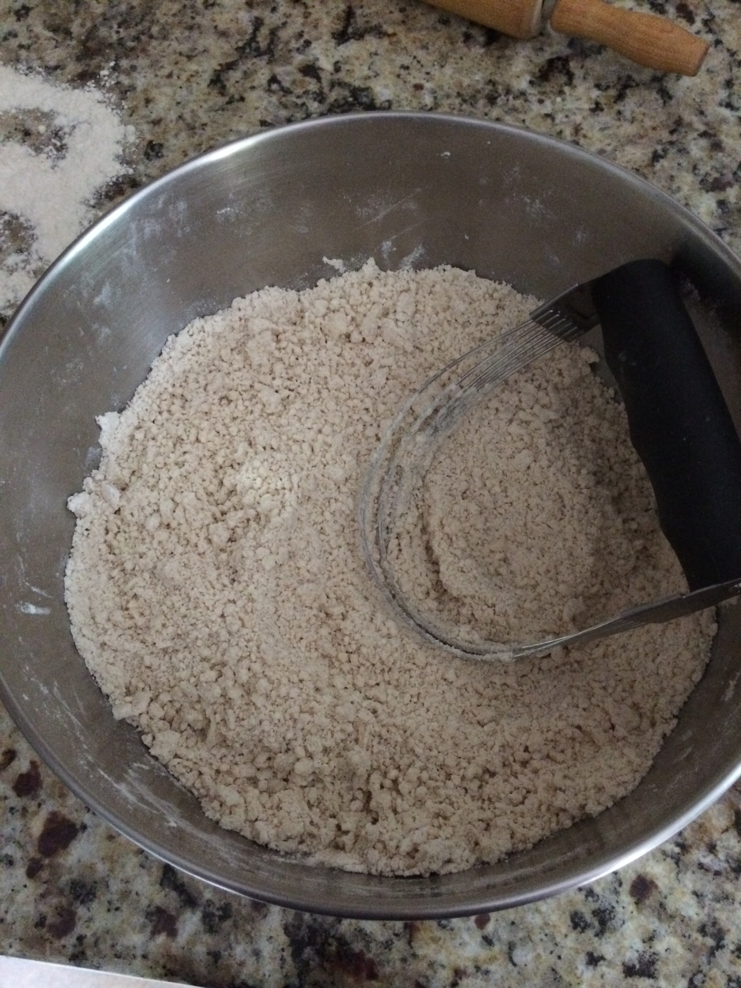 Use a pastry blender to cut in the fat until the mixture consists of “pea-size” pieces.