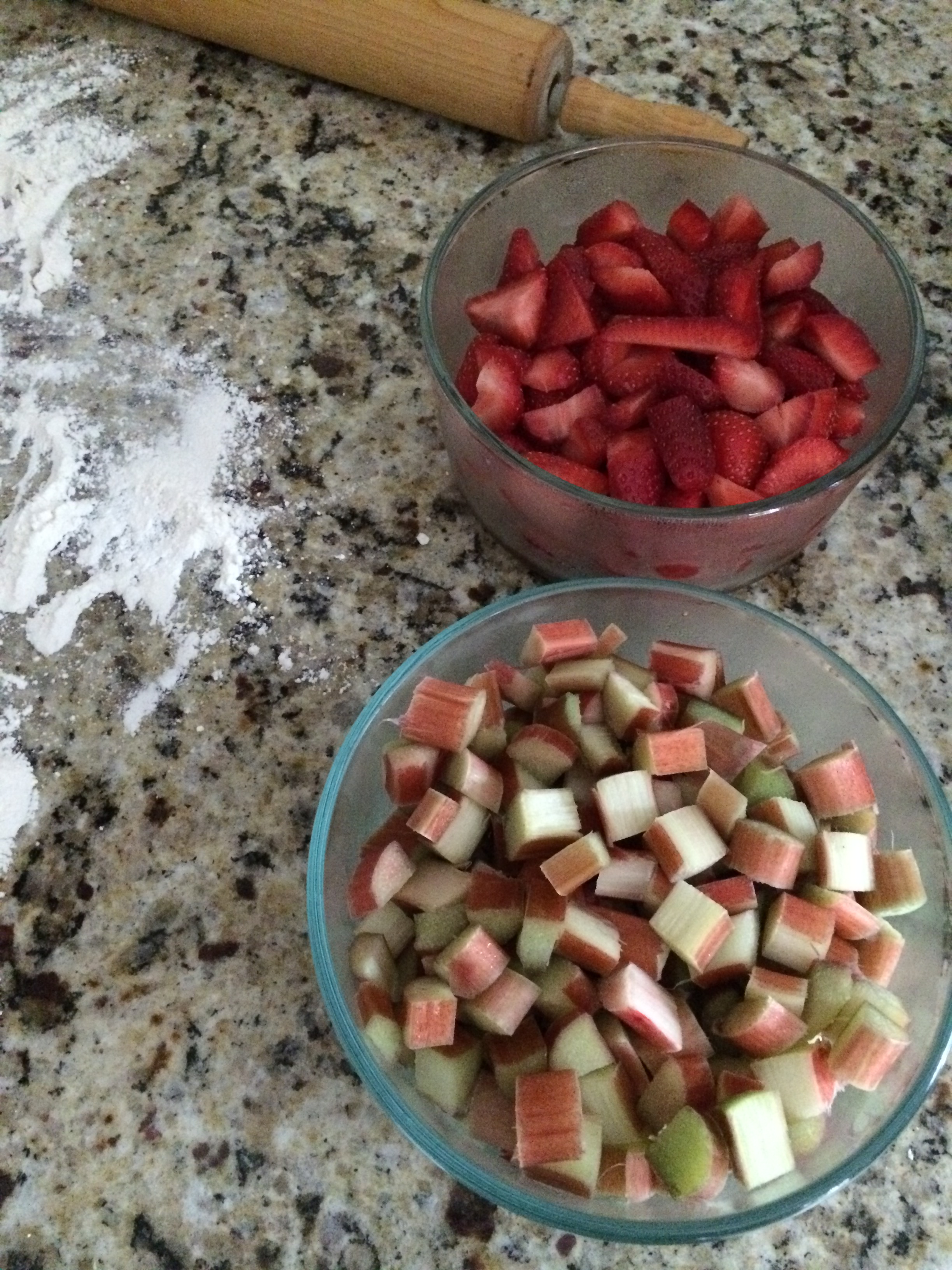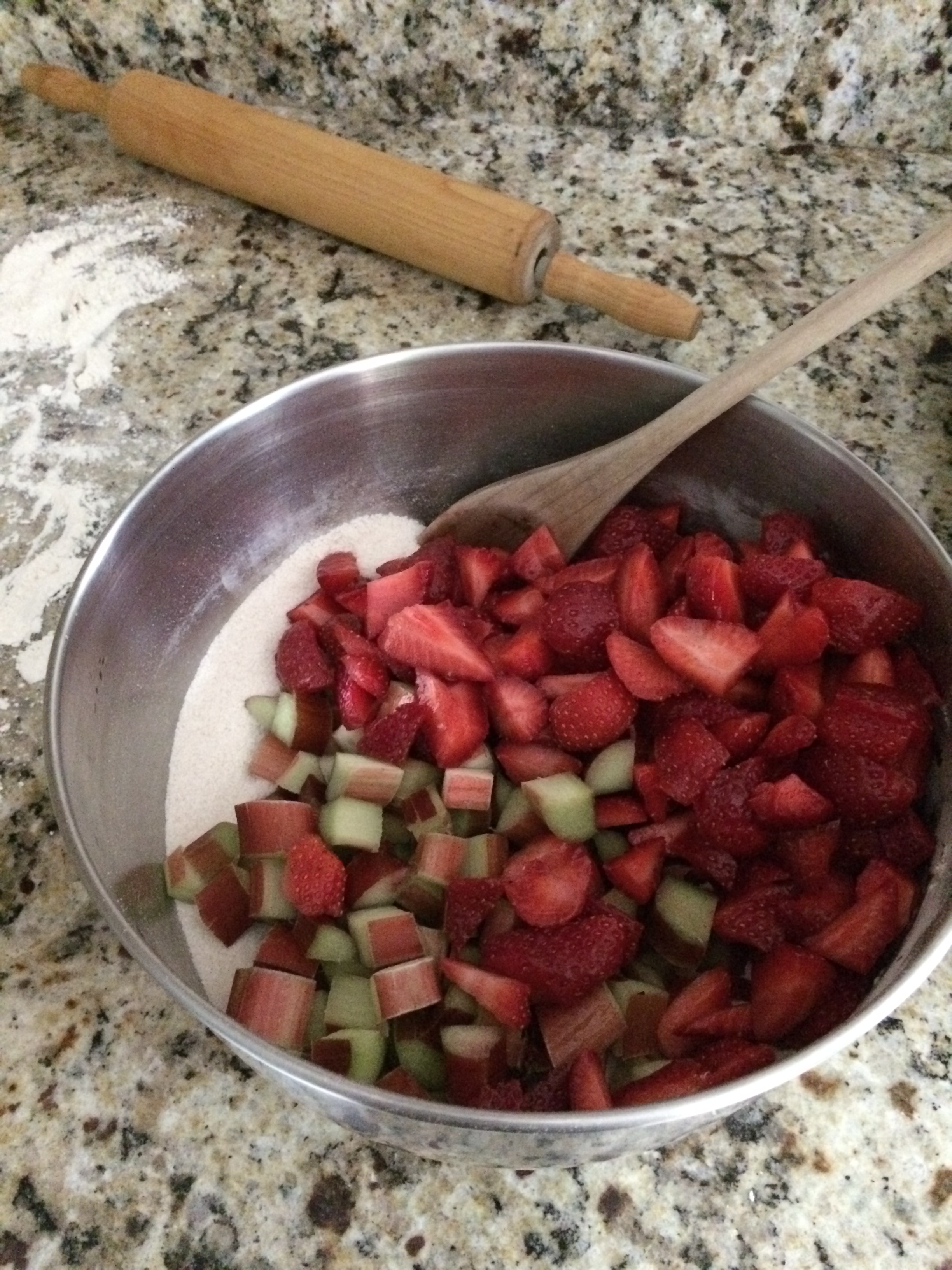 Whisk sugar, flour and cinnamon together in large bowl. Add in rhubarb and strawberries and gently stir with wooden spoon until well combined.