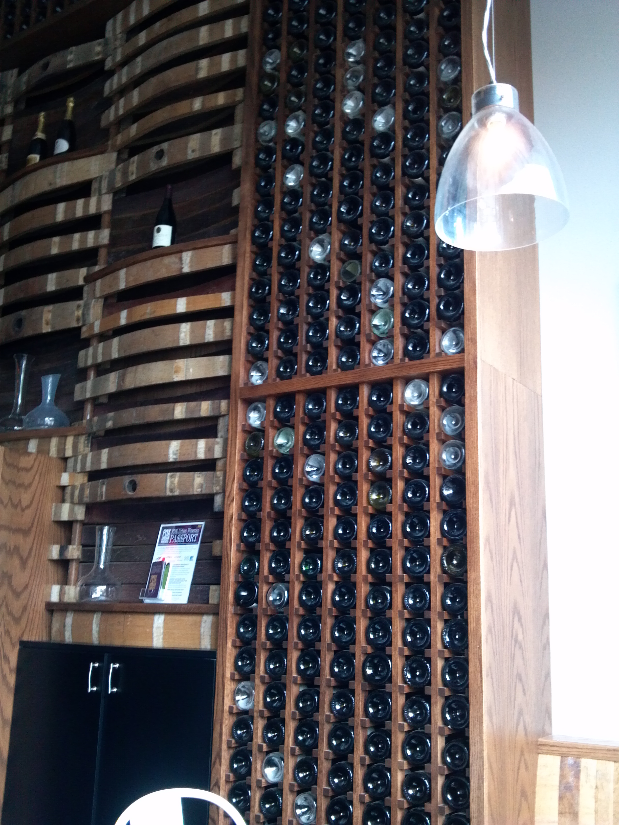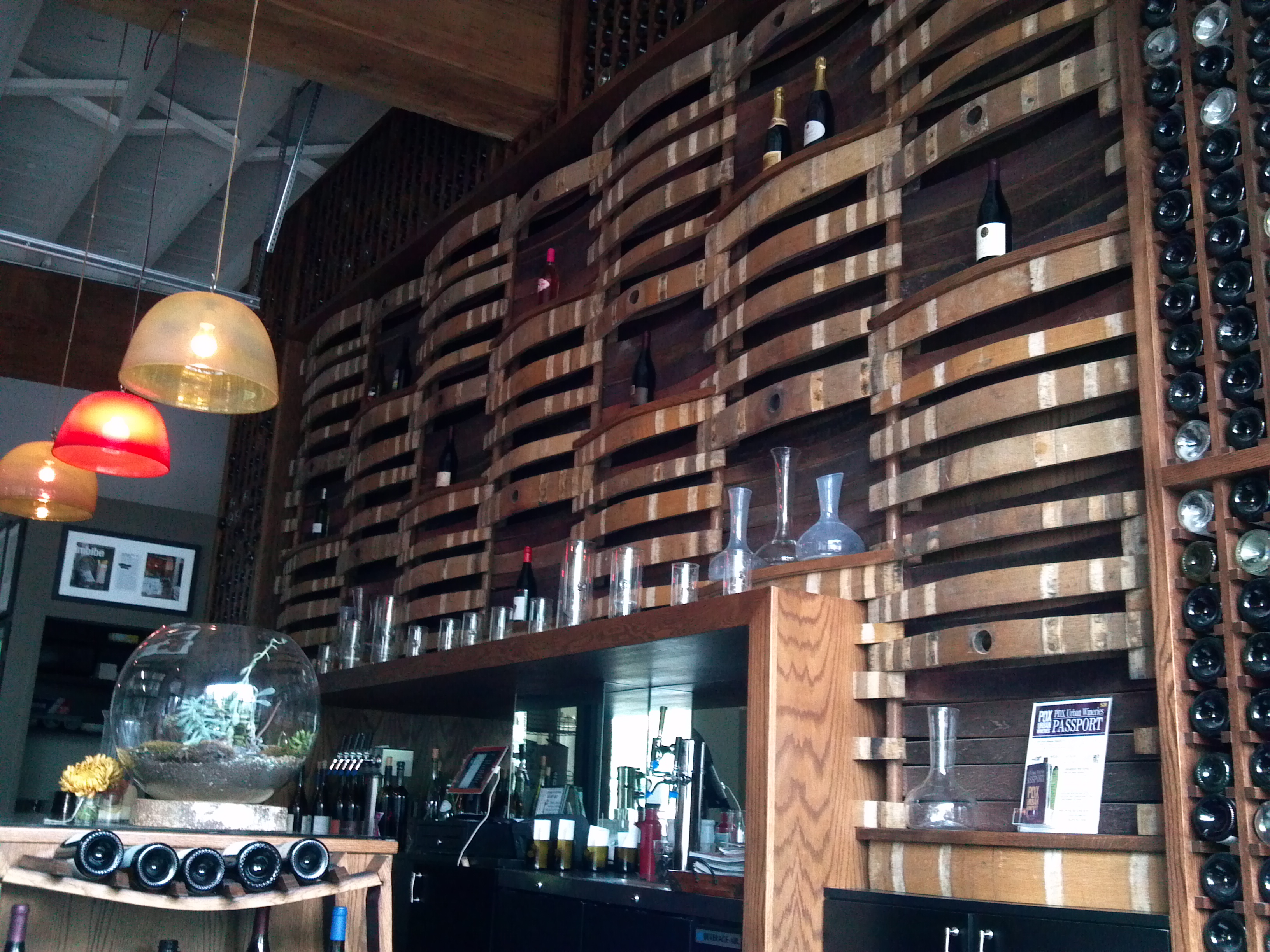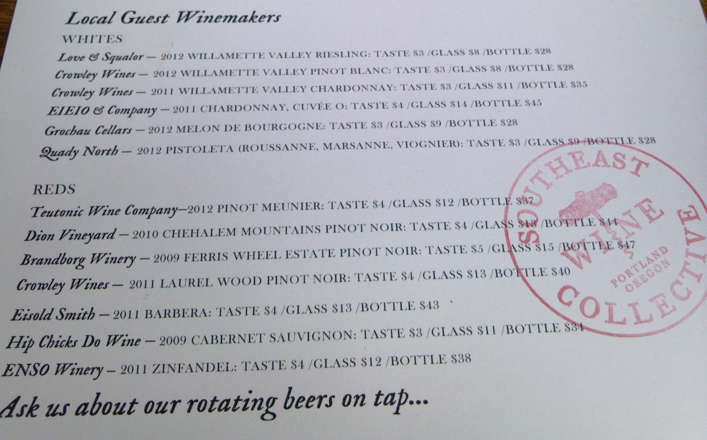 In search of an urban winery, we googled ‘Portland wineries’ in Nicole’s neighborhood and found SouthEast Wine Collective. We walked into an eclectic tasting room, which essentially was a wine bar. The room had a glass window as a wall, to let wine tasters view the wine production first hand. Harvest time was in full swing and we were told the wine makers were making sure they planned their grape picking precisely. This winery was a collection of wine makers and growers from seven different vineyards around the Portland area. We met one of the co-owners and her adorable Labrador (Cass), who greeted everyone at the door. This “supervisor” even has a wine named after him, Red Collar Pinot Noir.